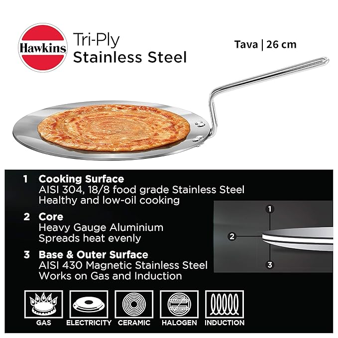 • Designed for making perfect Rotis ? on gas or induction • 4.88 mm Extra-thick metal heats evenly, stays flat even after heavy use, to maximise contact on induction cooktops