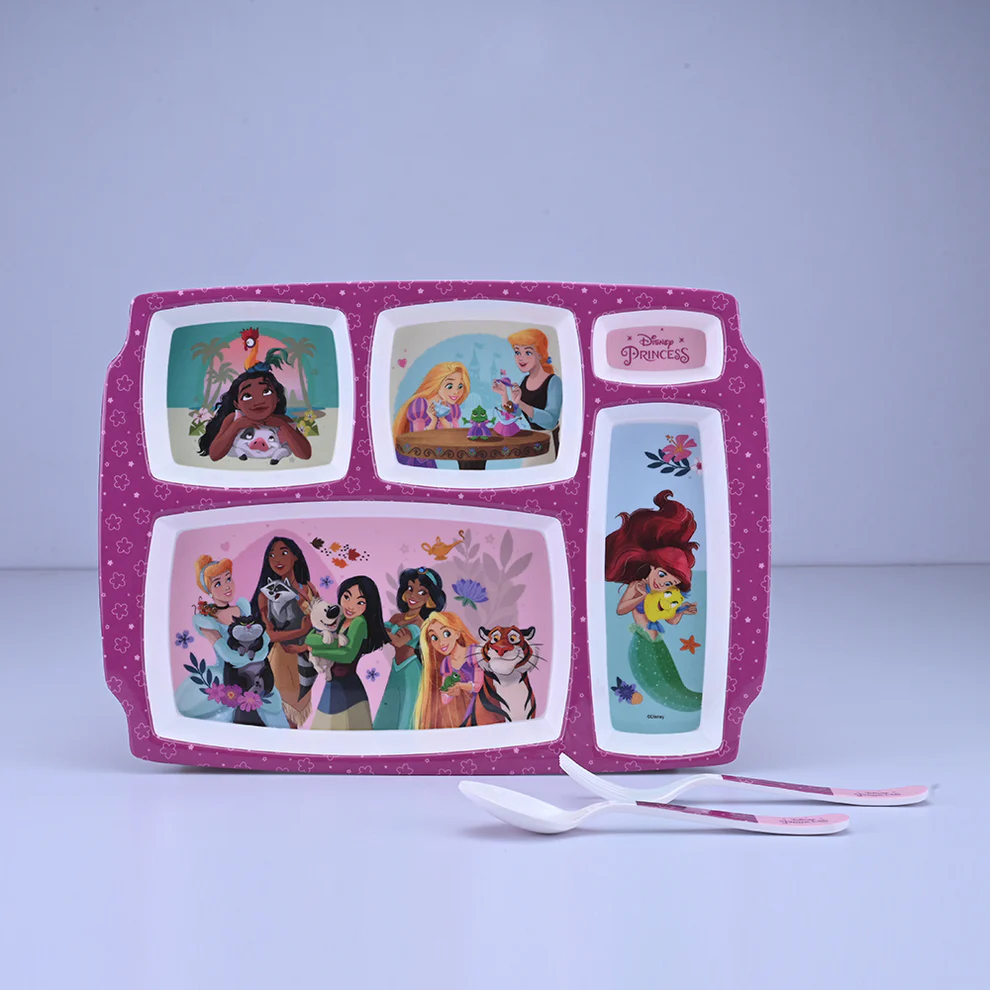 Servewell 3 piece and 5 partition dinner set is the perfect choice for your little munchkins. It comes with a spoon and a fork, which are the two most commonly used utensils while having dinner. It also has 5 different partitions to serve the 5 different things in a single plate. Your little princess is bound to finish all of her veggies if served in this fairytale themed dinner set.